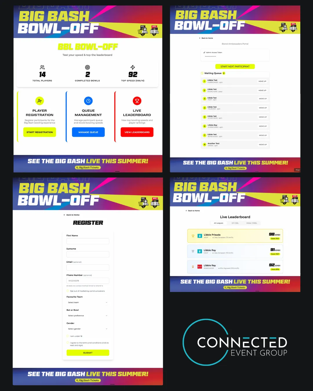 These gamified experiences integrate seamlessly with Connected Event Group’s AV and tech infrastructure, so live updates, audio cues, or visuals on LED screens can enhance the energy of the moment. A recent example is the Big Bash Bowl Off 2025, where fans engaged through a fully branded microsite and leaderboard, making the excitement of the game digital and interactive.