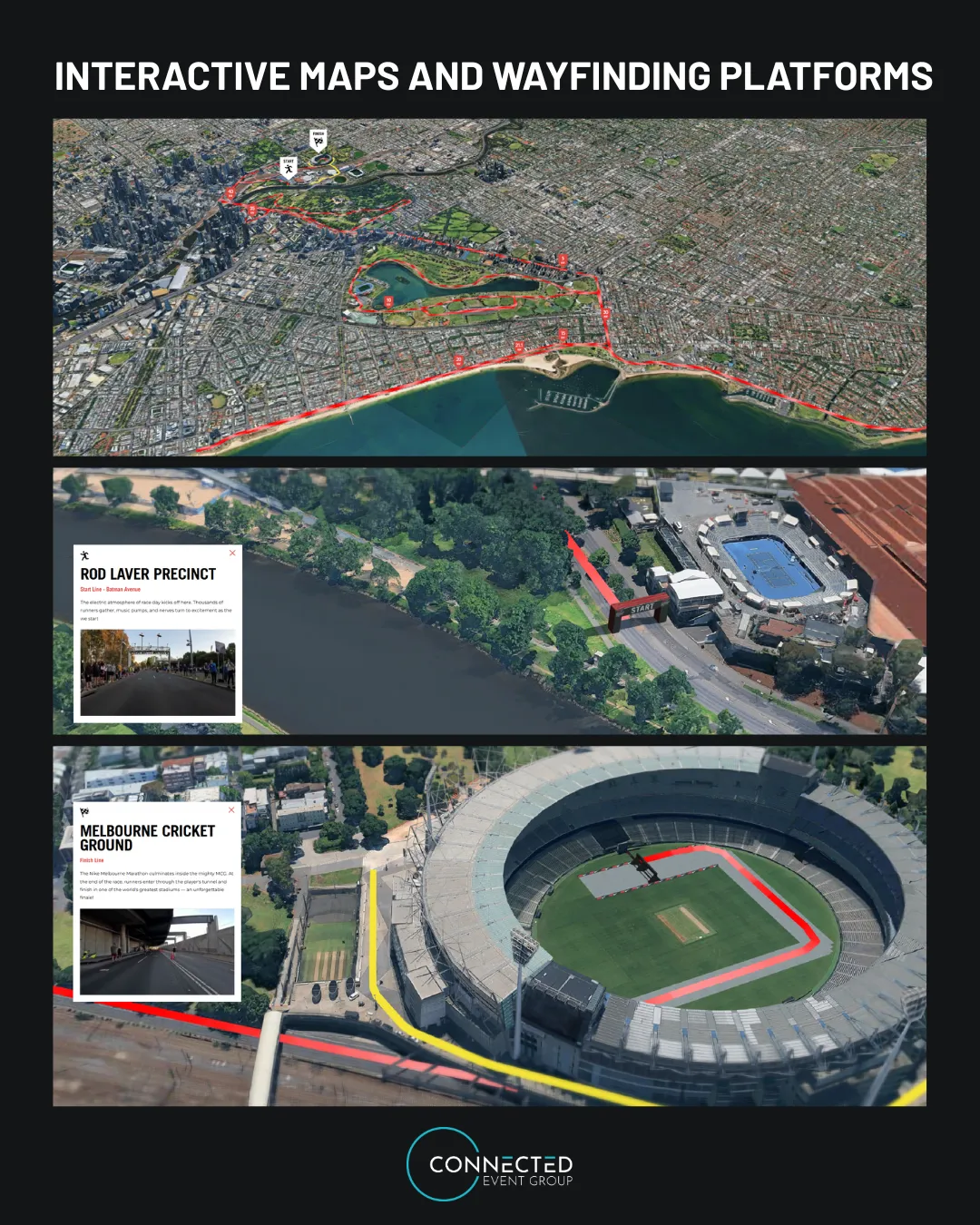 Integration with AV technology means live session info, sponsor content, or directional updates can be displayed on digital screens throughout the event. For example, The Melbourne Marathon used our platform to showcase the full route and interactive checkpoints, giving participants an engaging pre-event experience and extending excitement beyond race day.